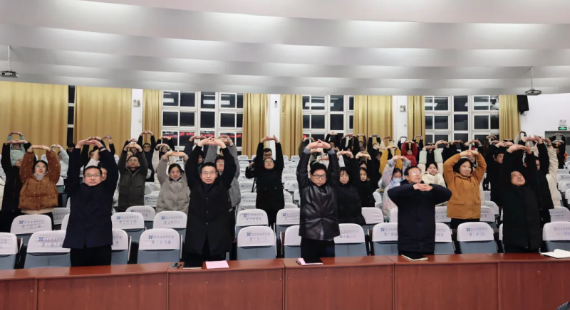 会议伊始,体育组顾若涵老师带领全体教师学习“八段锦”健身动作。老师们在舒缓的节奏中舒展身体、放松心情,不仅缓解了日常工作的疲劳,也体现出学校对教师身心健康的细致关怀。