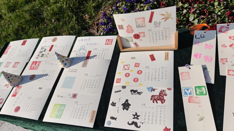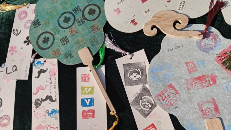 橡皮章展区作品形式多样,有不同形状的麻宣扇子、鎏金扇子,还有书签、牛皮纸袋和日历卡纸。上面印着同学们精心刻制的橡皮章图案,走近一瞧,有“福”、“吉”、“如意”等吉祥字样,还有“马”、“蝴蝶”、“葫芦”、“鱼”、“元宝”等有寓意的图形。每件作品的构图、色彩搭配各具巧思,体现了淮外学子的无限创意。微风拂过,流苏轻晃,年味悄悄在校园中弥漫……