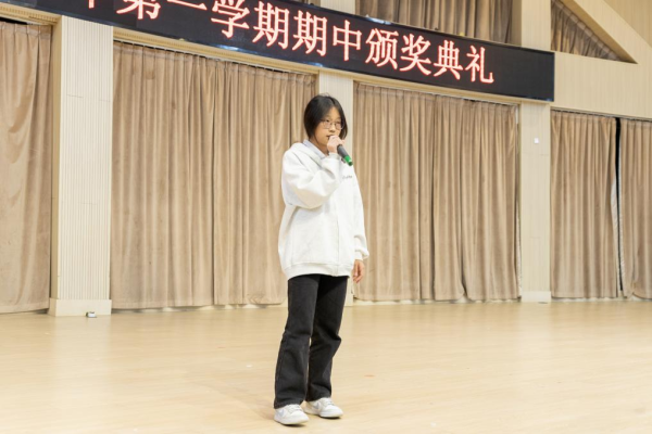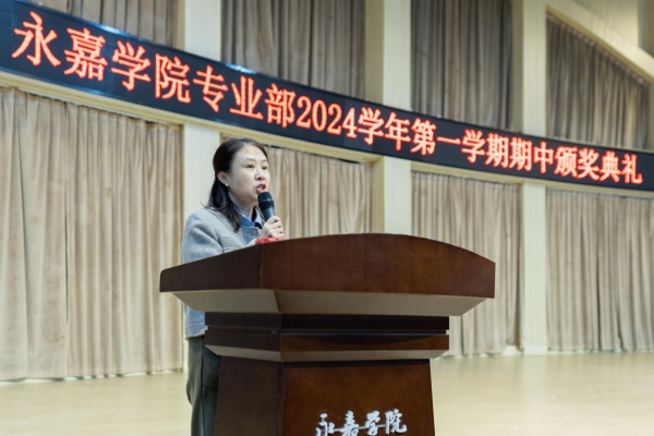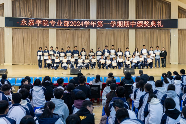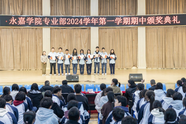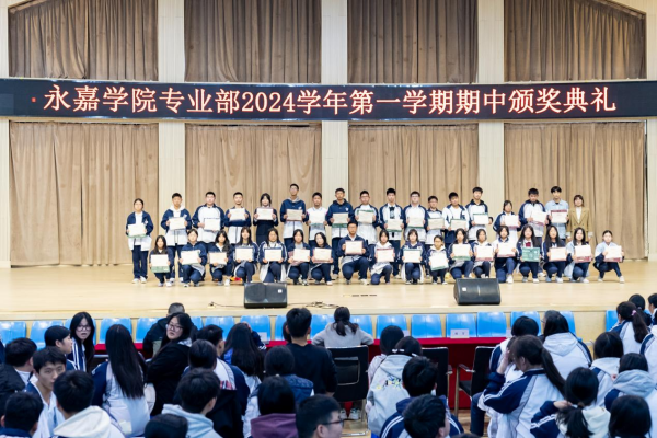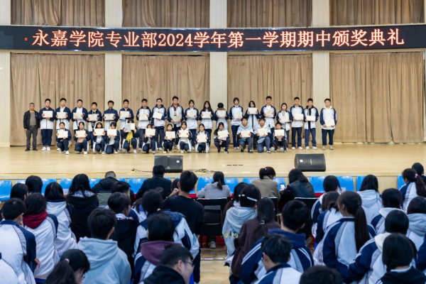在金秋送爽、硕果累累的季节里。2024年11月24日,永嘉二职专业部在体育馆举行2024学年第一学期期中颁奖典礼。本次大会由23会计3班金喃喃、24网安1班邵浩然主持,副校长谢丽莉,学生处处长胡文其,团委书记赵亚微,专业部主任周芳,专业部助理廖良臣、王惠、罗建群以及全体专业部班主任和学生共同参与。典礼伊始,谢丽莉发表开幕致辞。她强调,学习不仅要掌握理论知识,还要将所学知识应用于实践,不断提升自己的技能水平。每一次的失败都是成功路上的垫脚石,每一次的努力都是自我超越的见证,希望同学们保持对学习的热情与技能的追求,不断挑战自我,超越自我,在未来学习生活中取得更加优异的成绩。她的话语激励着在场的每一位同学,点燃了大家心中的学习热情与奋斗之火。颁奖典礼正式开启,谢丽莉为在上学期浙江省技能大赛获奖学生颁发奖金、“技术能手”荣誉称号证书以及定制奖品。22服装2班的潘韦嘉作为“技术能手”代表上台演讲。她表示此次获奖不仅是对她个人努力的肯定,更是团队合作共同奋斗的结晶。成绩的背后是无数次的练题与改进,是汗水与泪水的交织,展望未来,她将以更加饱满的热情、更加坚定的信念,投身到学习和实践中,不断提升自我,追求卓越。在发言的最后,她鼓励大家持续参与各类技能竞赛,勇于挑战自我,不断超越极限,为学校增光添彩。随后,由周芳表彰“军训感动人物”,他们在军训的艰苦历练中,展现出非凡的毅力和无私的奉献,不仅铸就了个人的坚韧与成长,更成为了照亮团队前行道路的璀璨灯塔,他们的精神与事迹,是军训中最宝贵的财富,激励着每一个人不断超越自我,追求卓越。其中“军训最强标兵”24电商5班陆子谦,军训中他站姿挺拔,脚步铿锵,口号响亮,以顽强的毅力、坚定的信念展现新时代青年风采。23动漫4班周语诺为大家带来了歌曲《最美的太阳》。她甜美的歌声如同温暖的阳光,洒满了整个大会,为大会增添了一抹亮丽的色彩。紧接着,“学习之星”“学习进步之星”“风云班委”“学科之星”以及“德育之星”也逐一揭晓。他们的努力和付出,值得我们每一个人的肯定与赞扬。