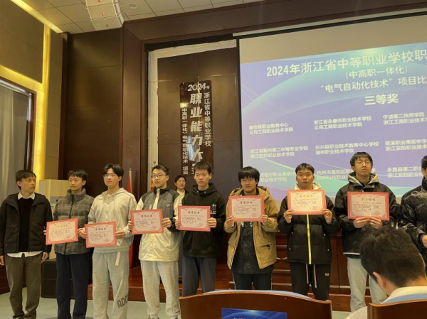 12月8日,2024年浙江省中高职一体化“电气自动化技术”赛项在温州市职业中等专业学校圆满落幕。永嘉县第二职业学校潘小宁(指导老师:陈亚杰)与浙江安防职业技术学院林圣翌(指导老师:代金坤)组队,经过激烈比拼,最终斩获三等奖。本次比赛由浙江省教育厅主办,以团体赛方式进行,每支参赛队由2名选手组成,中、高职选手各1名,对接有中高职一体化等合作办学的职业院校组队参赛。比赛内容依据浙江省电气自动化专业中高职一体化专业教学标准设置,包括电气控制线路设计与虚拟产线搭建、产线系统设计与仿真、系统功能联调、职业素养等,全面考查参赛选手的专业技能和综合素质。备赛期间,两校领导高度重视,专业部领导及先进制造业教研组全程紧密跟进,为师生给予了全方位、细致的指导与支持。尽管探索“线路搭建、程序编写、理论强化”的征程充满挑战,但潘小宁与林圣翌同学仍凭借其卓越的编程技艺与无间的团队协作,在激烈的竞赛中大放异彩,最终脱颖而出。此次获奖不仅是对潘小宁同学个人能力的肯定,也是对永嘉二职竞赛工作的肯定,学校将继续秉持“以赛促教、以赛促学”的教育教学理念,深化教育教学改革,创新人才培养模式,为学生给予更多展示自我、提升能力的机会和平台。
